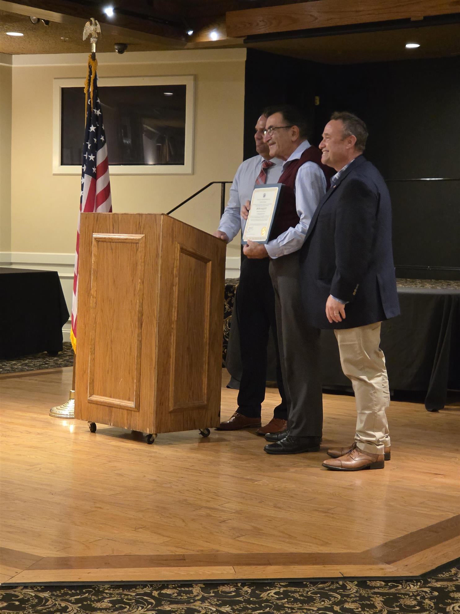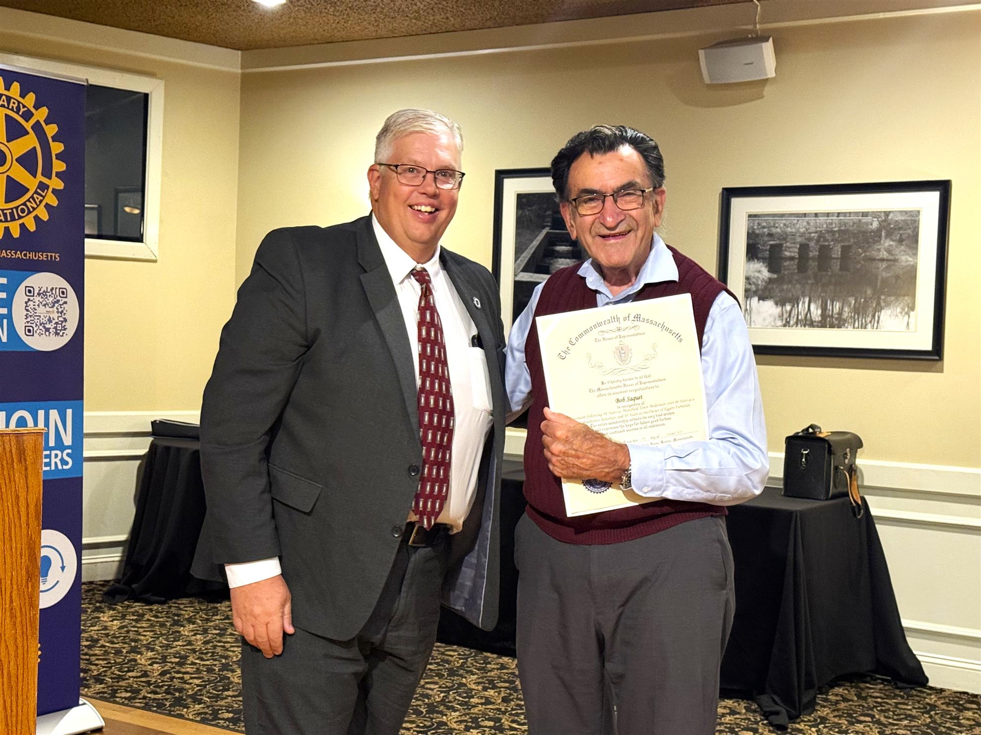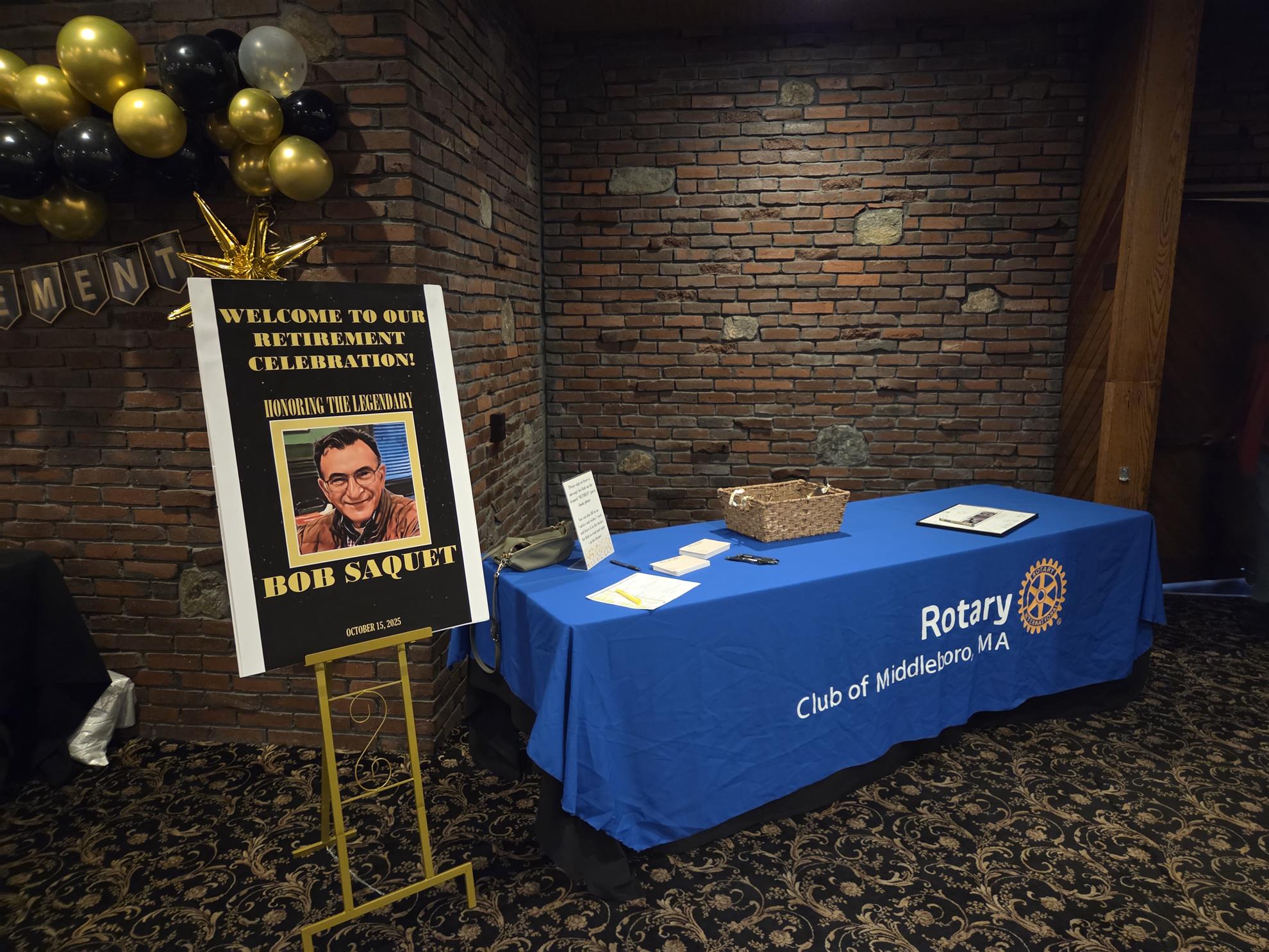 The Middleboro/Lakeville Rotary Club recently honored longtime member and community leader Bob Saquet with a surprise retirement celebration at the Fireside Restaurant. Bob, owner of Eggers Furniture, has devoted 60 years to the furniture industry, guiding the nearly 200-year-old Middleboro institution for the past 46 years. A respected and active Rotarian for 45 years, Bob has played a vital role in both business and civic life, also serving as Mansfield’s Town Moderator for more than 34 years and currently sitting on the Board of Directors for the Retailers Association of Massachusetts.Over fifty friends, family members, and community guests including Ken Butler - Mass Arts Ctr. executive director and Jim Mulcahy - Asst. to the Middleboro town mgr., gathered to celebrate Bob’s remarkable career and enduring community service. The evening was filled with laughter, heartfelt stories, and fond memories shared by those who have worked with or been inspired by him. During the event, State Representative Norman J. Orrall presented Bob with an official Massachusetts House of Representatives citation, recognizing his many contributions to the region. The Rotary Club extended warm wishes for a well-earned retirement, confident that Bob will continue to play an active and valued role in the communities he has long served.